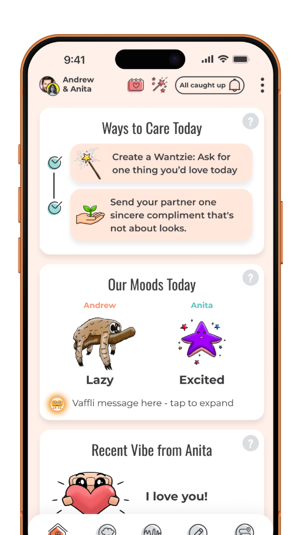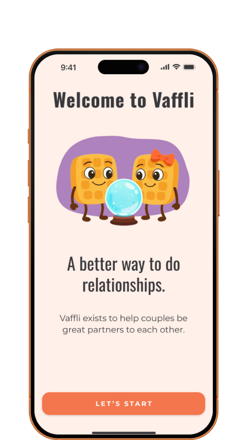 Because Vaffli offers daily connection rituals, ways to care for each other, understand each other better, discover each other’s thoughts and values, and learn and practice relationship skills — and, as a result, be happier being together.