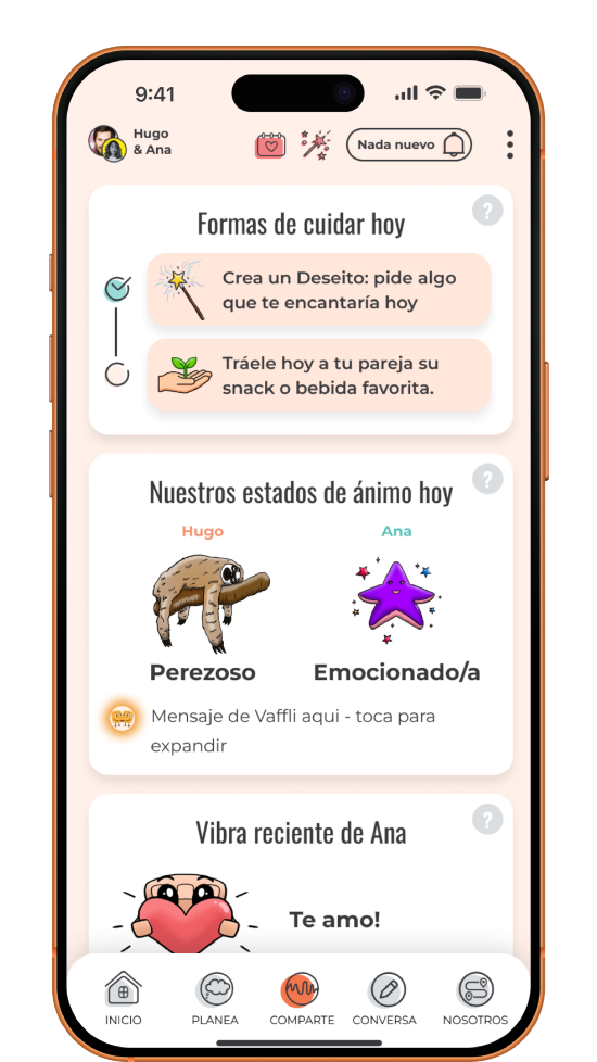 Porque Vaffli transforma pequeños momentos diarios en conexión real. Comparte cómo te sientes, envía un deseo, descubre lo diferente que pueden pensar y creen hábitos que los acerquen. Todo en solo 2 minutos al día.